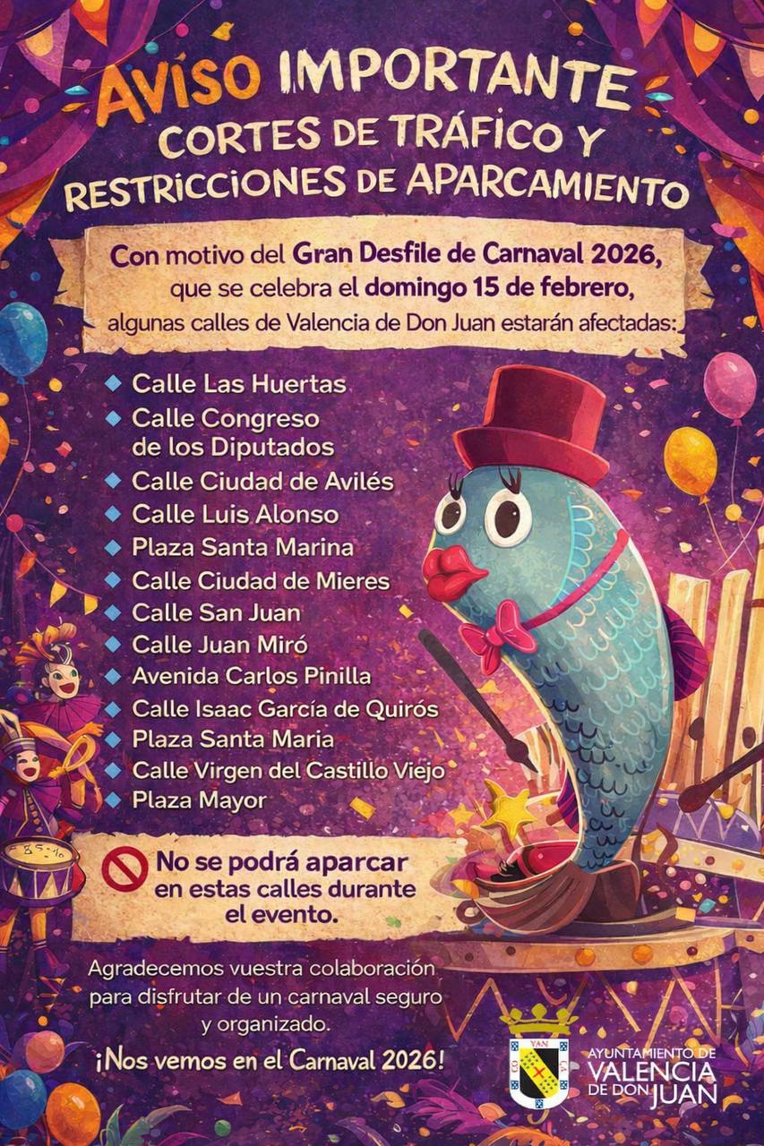 El Carnaval de Valencia de Don Juan se celebrará del 13 al 18 de febrero, siendo el acto central el Gran Desfile de Carnaval, que tendrá lugar el domingo 15 de febrero a las 17:30 horas. Más de 600 participantes, distribuidos en 40 grupos, llenarán de música, humor y color las calles de la localidad.